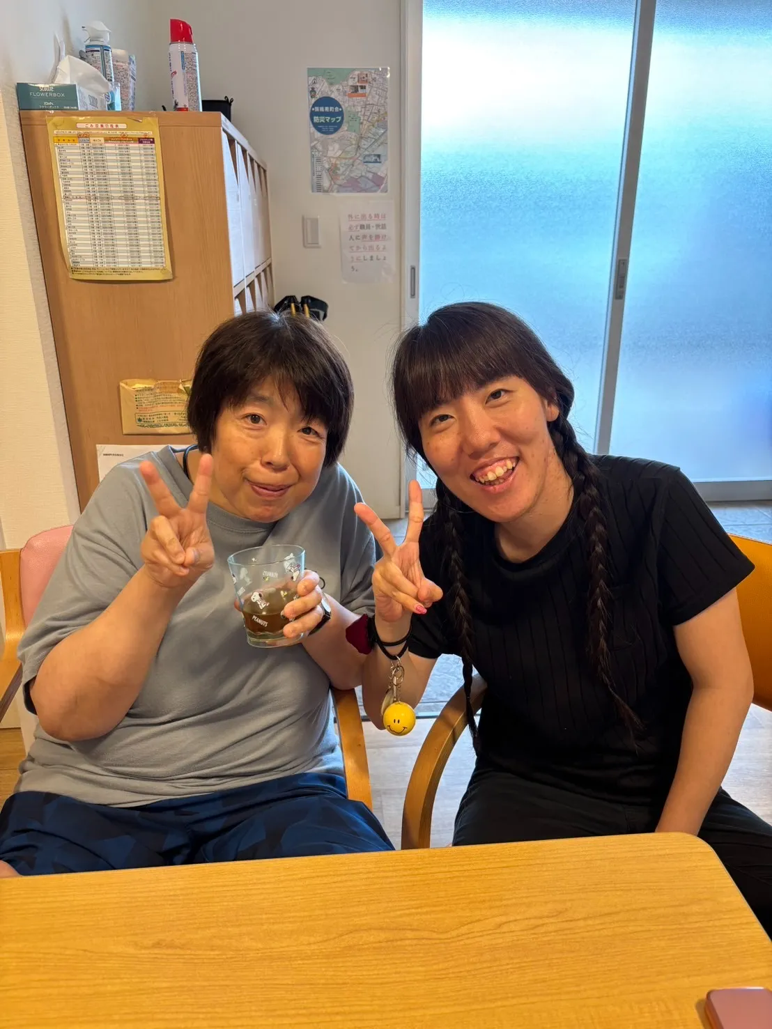 夕食前のひととき、利用者様おふたりが、いつものように共同スペースで仲良くお話しされていました。