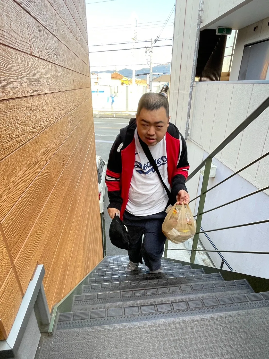 袋をしっかりと持ちながら階段を上がる姿は、とても頼もしく、嬉しそうな表情も印象的でした。