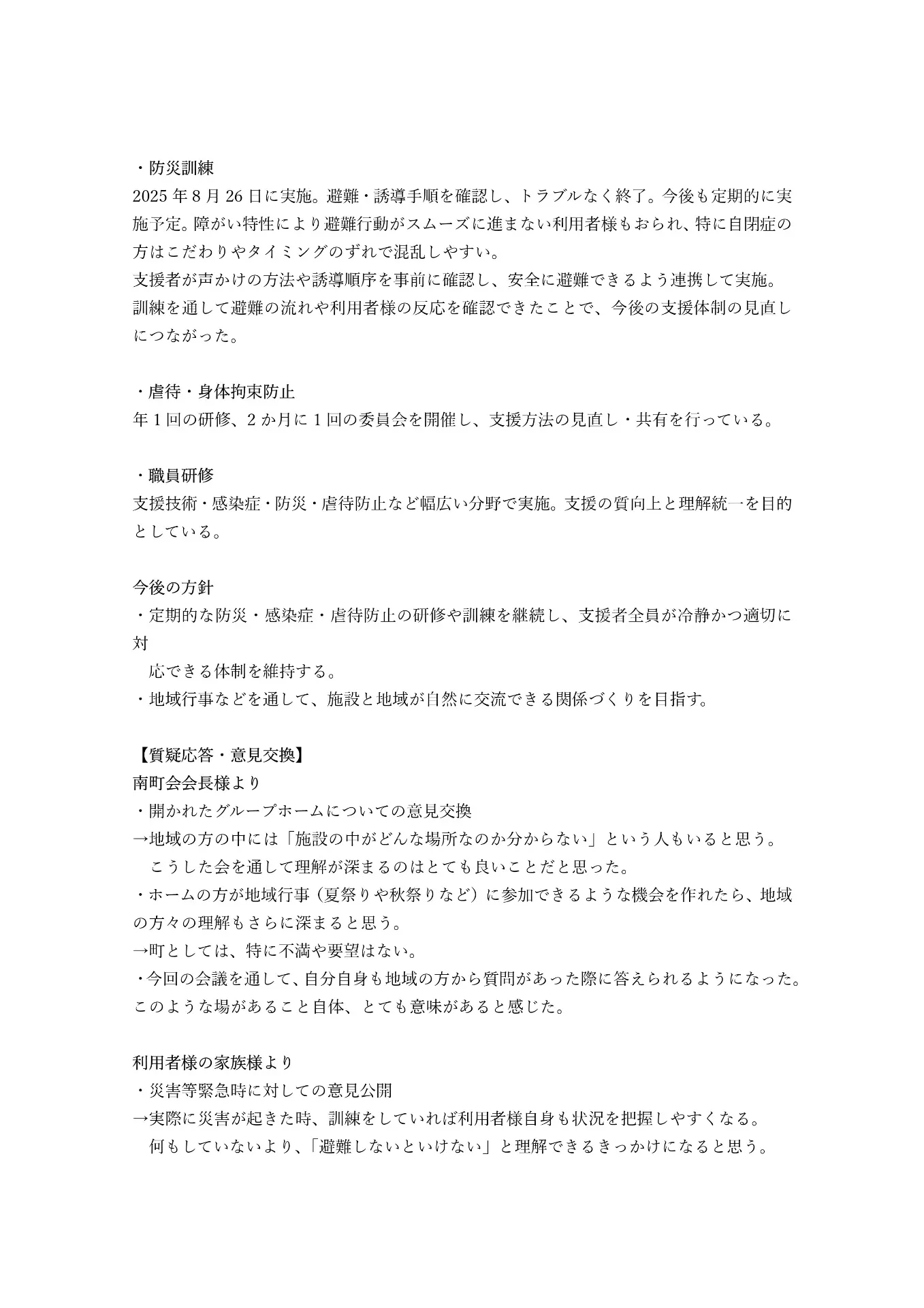 ・地域と施設が協働し、利用者様・家族様が安心して暮らせる環境づくりを進めていくことを確認した。