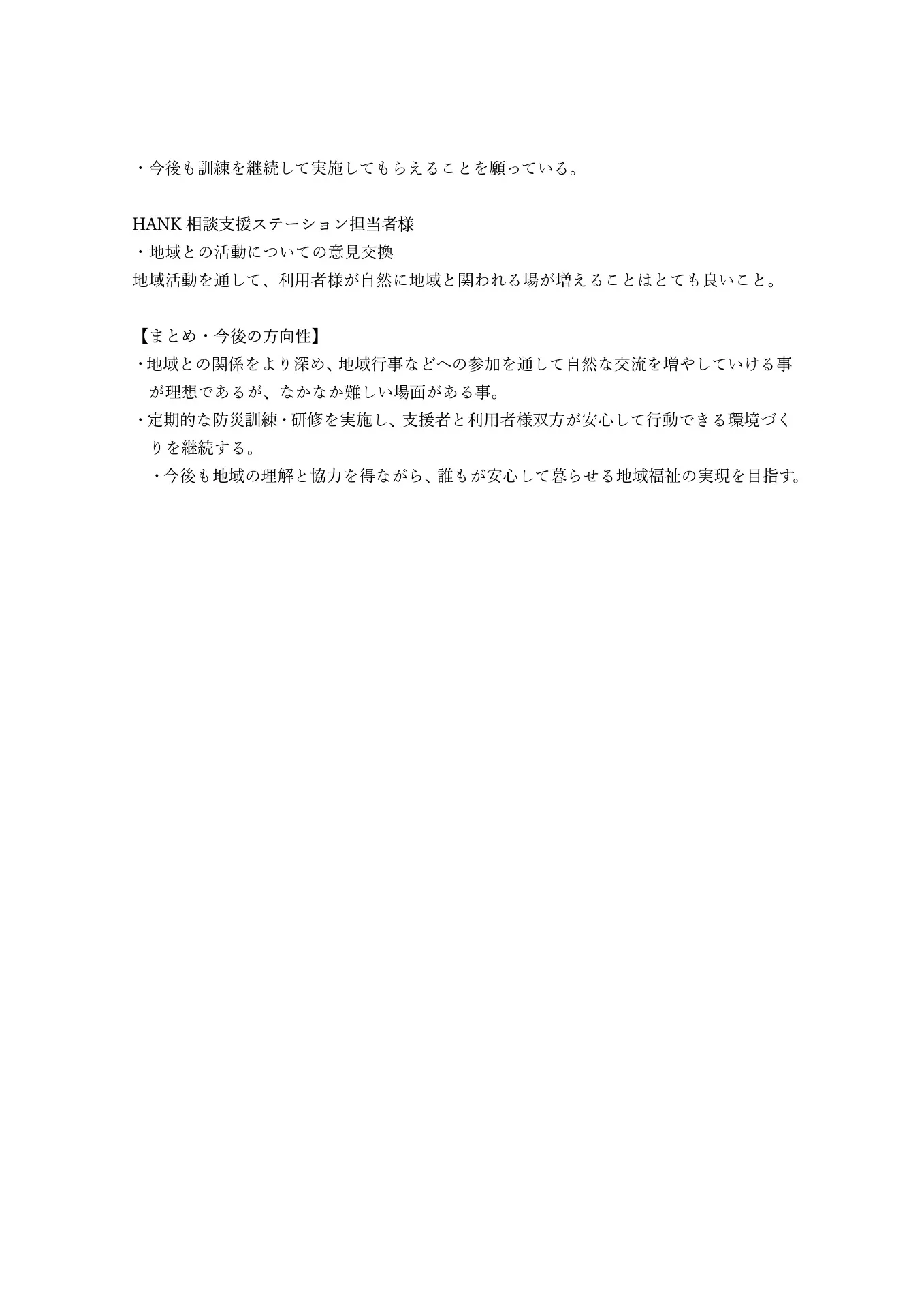・定期的な防災訓練・研修を実施し、支援者と利用者様双方が安心して行動できる環境づくりを継続する。