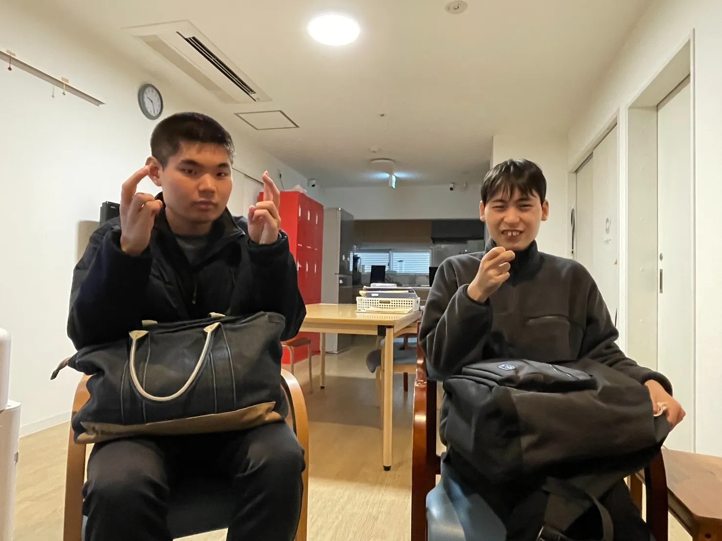 バッグをしっかりと抱え、指でポーズを取りながら待つ姿からは、「今日も一日頑張ろう」という気持ちが感じられます。