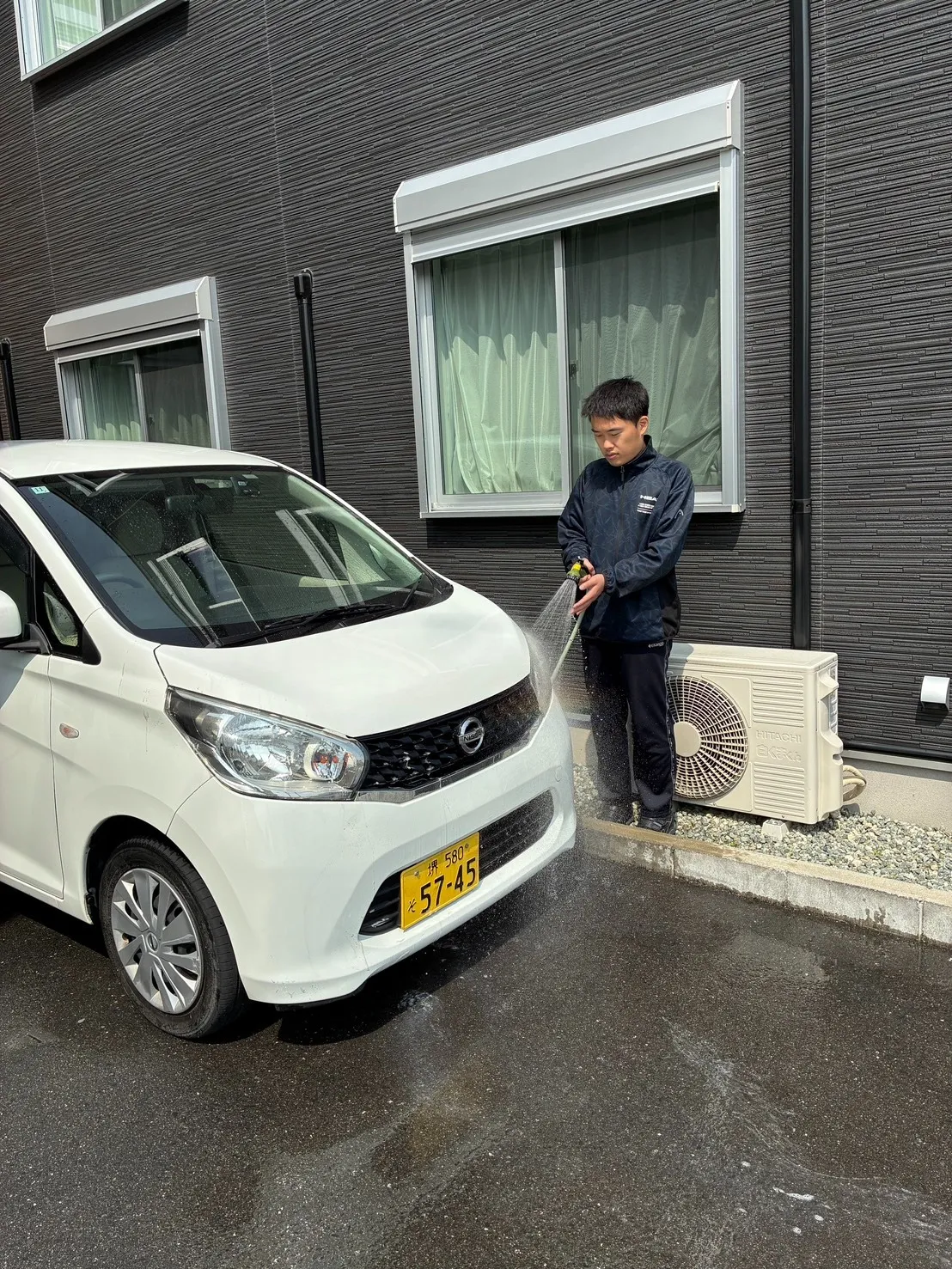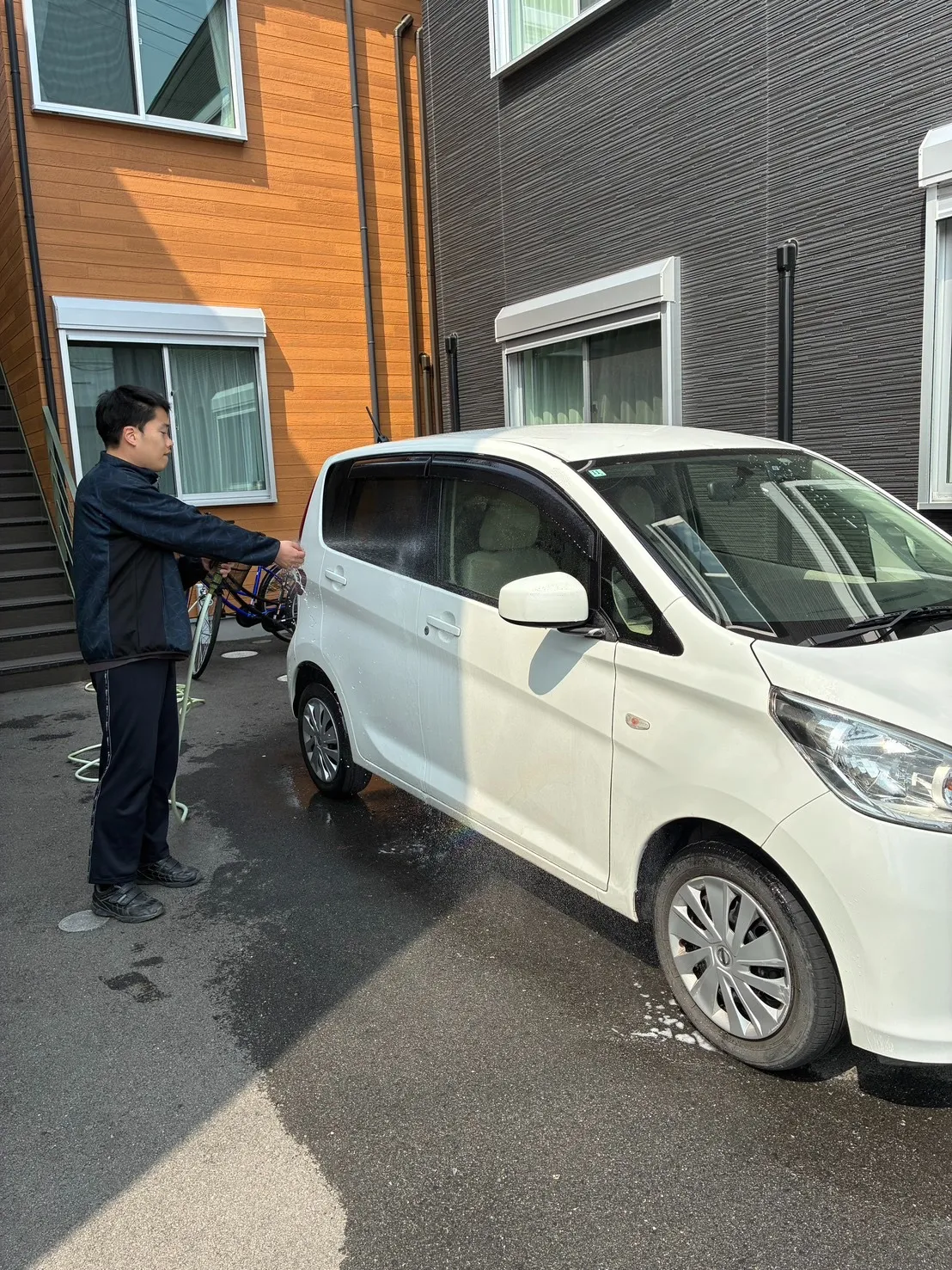 ホースで車に水をかけながら、